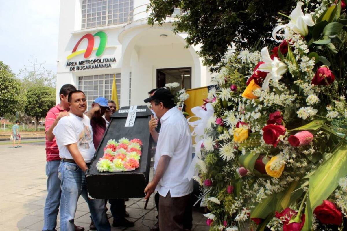 42 días de huelga de hambre lleva Aníbal Perea, quien se ha convertido en el símbolo de los propietarios de taxi-camioneta que protestan frente a las instalaciones del Área Metropolitana de Bucaramanga, AMB, exigiendo que les renueven la tarjeta de operación y los dejen trabajar.
