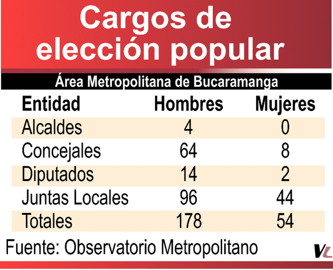 Bucaramanga es la que mayor número de concejalas tiene: cinco (Sandra Pachón, de Cambio Radical; Carmen Lucía Agredo, del Partido Conservador; y Sonia Smith Navas, Nancy Lora y Martha Antolínez, del partido Liberal.