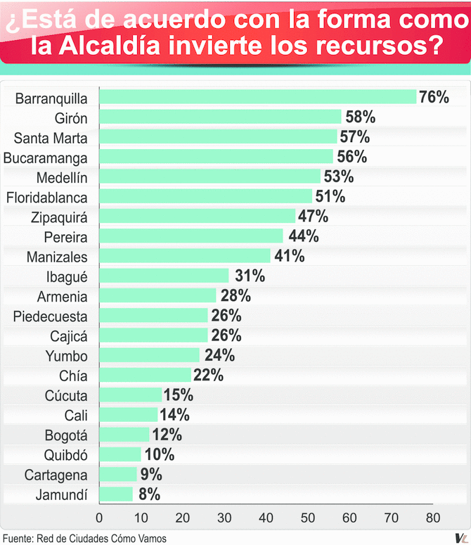 7 Recursos públicos y corrupción: En apenas cinco de las ciudades evaluadas por la referida encuesta de percepción ciudadanas, más del 50% de la población encuestada aprueba y está satisfecha con la forma en que la Administración Local invierte los recursos. Barranquilla se destaca con un 76% de favorabilidad. Por el contrario, Cúcuta, Cali, Bogotá, Quibdó, Cartagena y Jamundí, la satisfacción no supera el 20% de la población encuestada y con ciudades donde tienen una mayor percepción de corrupción.