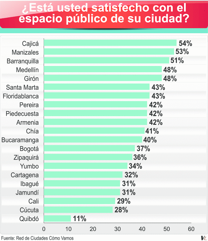 5 Espacio público: Apenas el 37% de la población de las ciudades capitales está satisfecha con el espacio público de su ciudad, valor inferior a la misma variable en las ciudades no capitales. Cajicá, Manizales y Barranquilla son las únicas ciudades donde más del 50% de la población está satisfecha, mientras que en Cali, Cúcuta y Quibdó la satisfacción no supera el 30%.