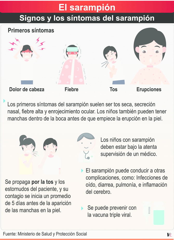 El Ministerio Nacional de Salud y Protección Social explica que el sarampión es una enfermedad causada por un virus, se desarrolla en el ser humano y se transmite con la inhalación de pequeñas gotas de secreciones respiratorias, expulsadas en el estornudo.
