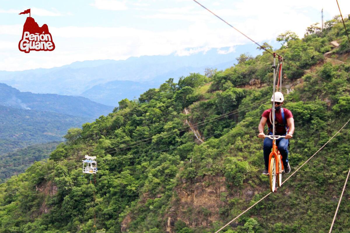 En el Centro Recreacional de Deportes Extremos El Peñón Guane, ubicado en el kilómetro dos en la vía que conduce de San Gil a Barichara podrá poner a prueba su adrenalina y vencer el miedo a las alturas con el bicicable.