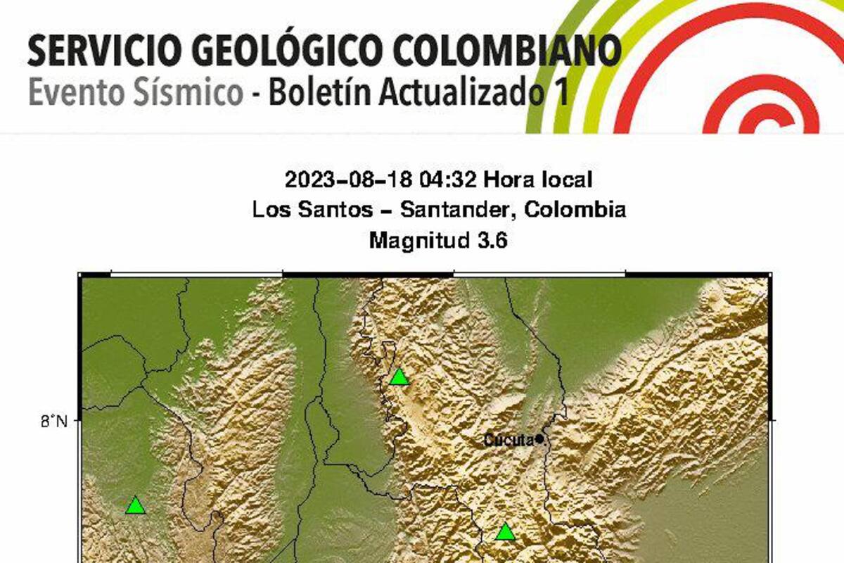 El Servicio Geológico Colombiano reportó un sismo de 3.6 en la madrugada de este viernes en Los Santos, Santanter.