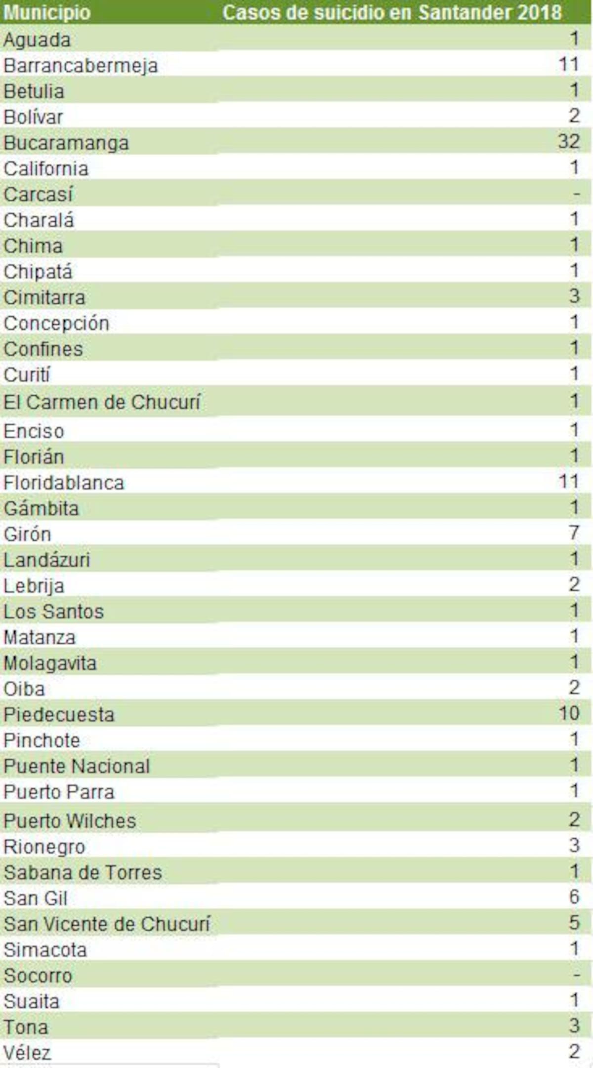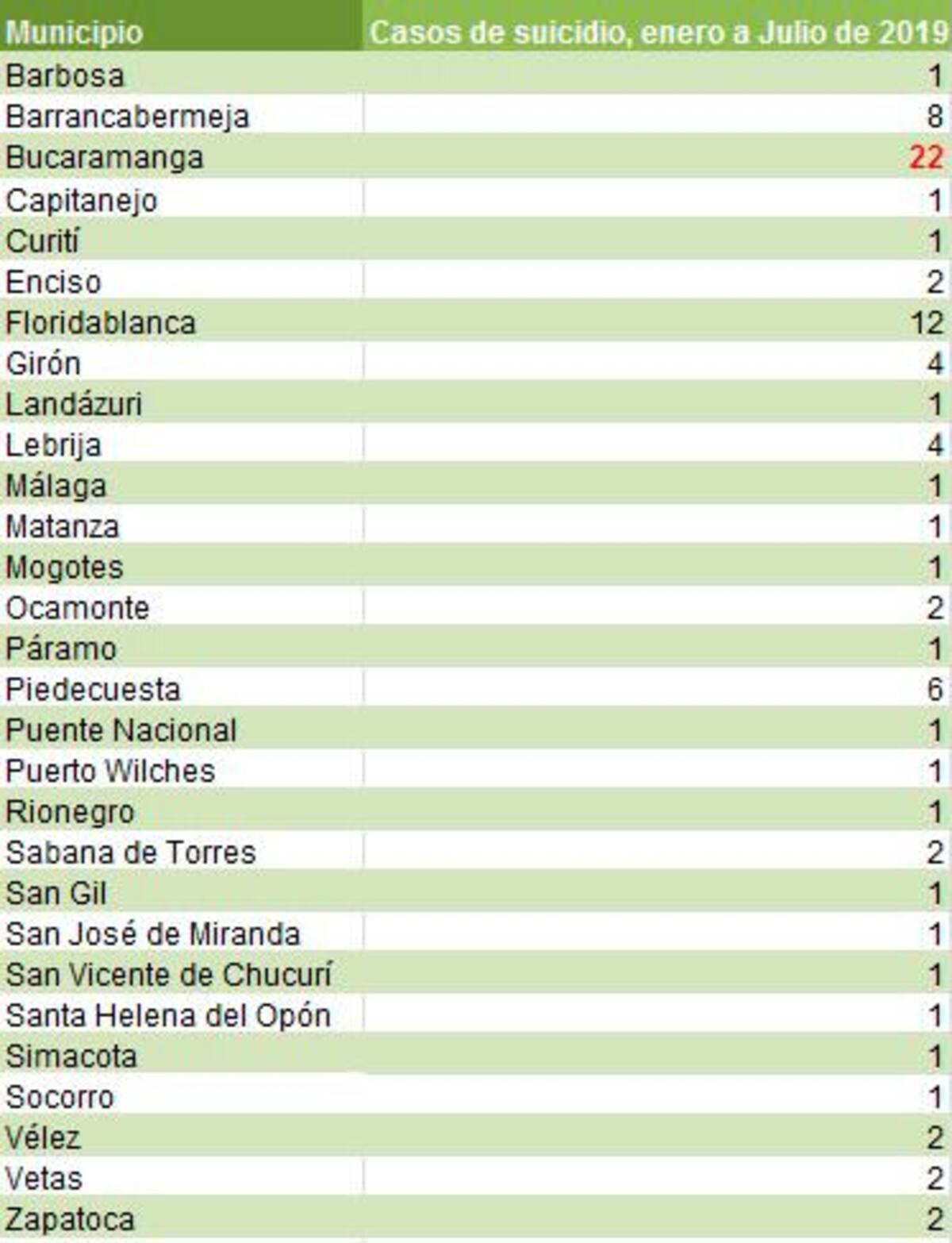 Las cifras también muestran que 28 de los municipios del departamento tienen una tasa de intento de suicidio mayor que la nacional. Algunos como Charta, reportaron 117,7 casos; Coromoro, 157; Enciso, 287; Oiba, 106,3; San Miguel, 130, y Zapatoca, 125.