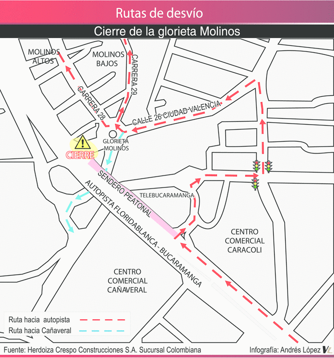Para continuar con las obras de prolongación de la paralela oriental TCC - Molinos Altos, el consorcio Herdoiza Crespo Construcciones S.A. cerrará desde este martes 20 de noviembre, a partir de las 8:30 a.m., el ingreso a la glorieta de Molinos, desde la autopista Floridablanca - Bucaramanga.