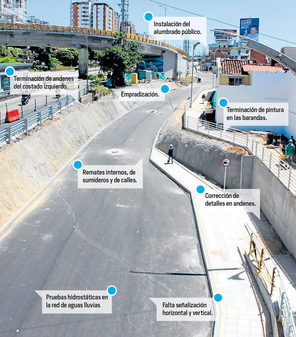 Incluso, hace pocos días, funcionarios del Invías realizaron una visita técnica a la zona de obra donde se evidenciaron que aún faltan varios aspectos y hasta que no queden listos, no será posible darla al servicio. Claro está que algunos de ellos, como lo es instalación de señalización horizontal y vertical, empezaron a avanzar en las últimas horas.