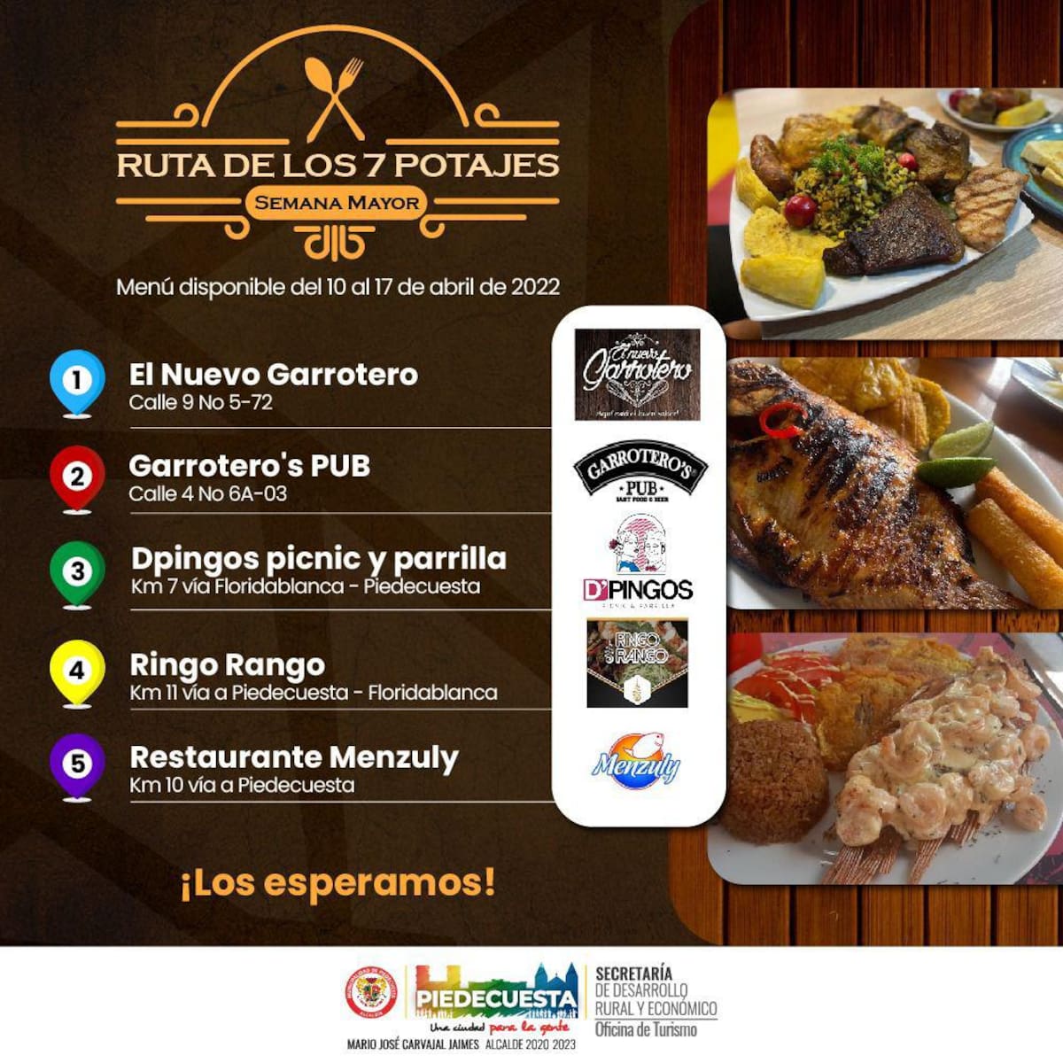 Los restaurantes vinculados son D’Pingos, Menzuly Piedecuesta, Parque Acuático y Panachi, Ringo Rango, Nuevo Garrotero y Garroteros Pub, que tendrán los menús disponibles hasta el próximo domingo de resurrección.