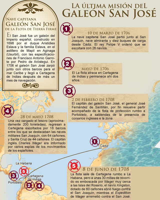 El San José era la principal nave de los galeones españoles. Esta embarcación formaba parte de los galeones que hacía la llamada “carrera de las Indias”, trayendo mercancía de Europa para las ferias de Portobelo (Panamá) y la de Jalapa (México). Cuando realizaba su viaje de regreso al viejo continente, cargaba la plata de las minas de Potosí y demás oro de los impuestos españoles en América.