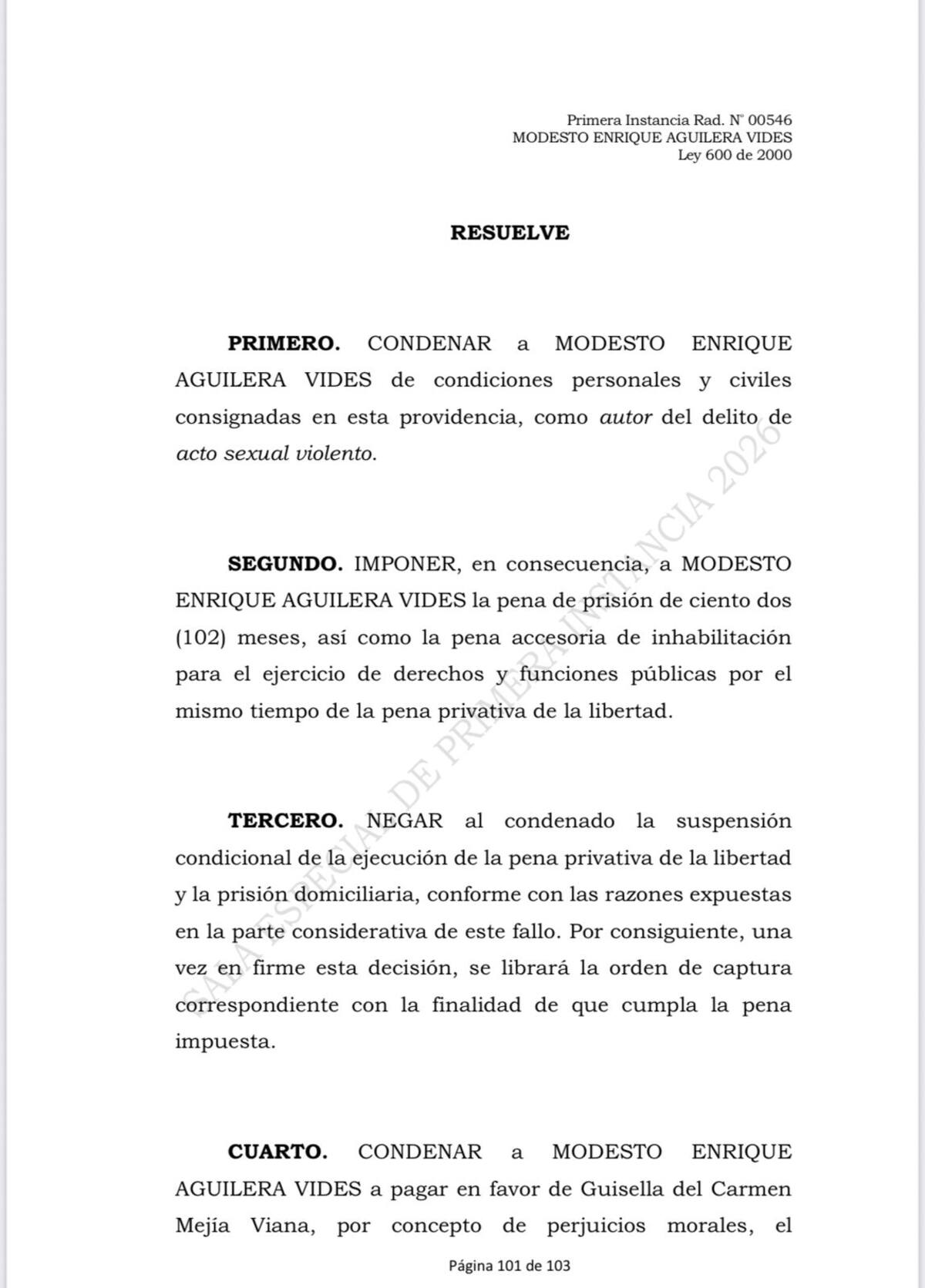 La Corte Suprema de Justicia condenó a 102 meses de prisión (más de ocho años) al representante a la Cámara por el Atlántico Modesto Enrique Aguilera Vides, del partido Cambio Radical, tras hallarlo responsable del delito de acto sexual violento contra una joven en un hotel de Barranquilla.