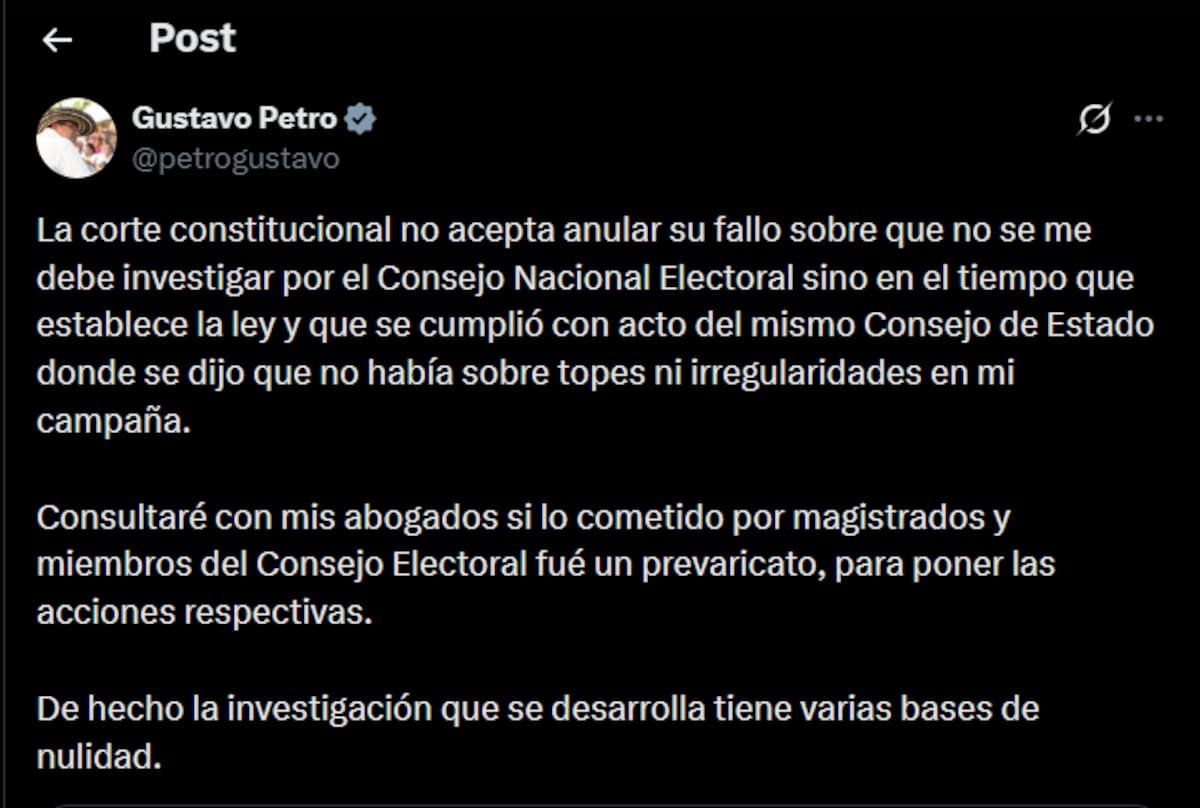“Consultaré con mis abogados si lo cometido por magistrados y miembros del Consejo Electoral fue un prevaricato, para poner las acciones respectivas”, afirmó el mandatario desde su cuenta de X.
