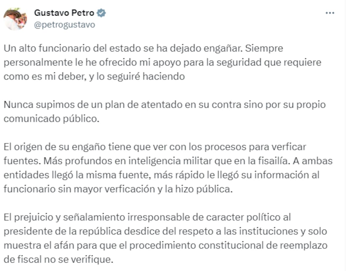 "Nunca supimos de un plan de atentado en su contra sino por su propio comunicado público", dijo el presidente Petro.