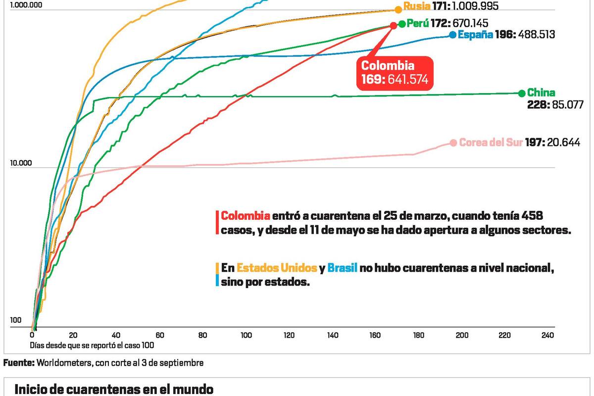 Incluso, para algunos resulta paradójico que se cerrara el país cuando había menos de 500 casos activos y se esté adelantando la apertura gradual ahora que Colombia es el séptimo en el mundo en casos activos, el quinto en muertes diarias y el sexto en casos nuevos (datos con corte al 3 de septiembre).