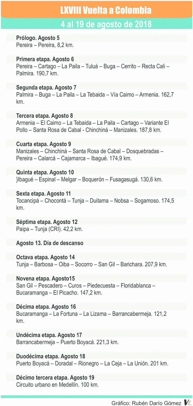 Serán 1.986,2 kilómetros en los que el giro nacional transitará por nueve departamentos (Antioquia, Boyacá, Caldas, Cundinamarca, Quindío, Risaralda, Santander, Tolima y Valle). Tendrá etapas planas, de media montaña y ascensos míticos como el del Alto de La Línea y el Alto de El Pichaco, exigentes subidas en las que seguramente se jugarán buena parte de las aspiraciones al título de la Vuelta a Colombia.