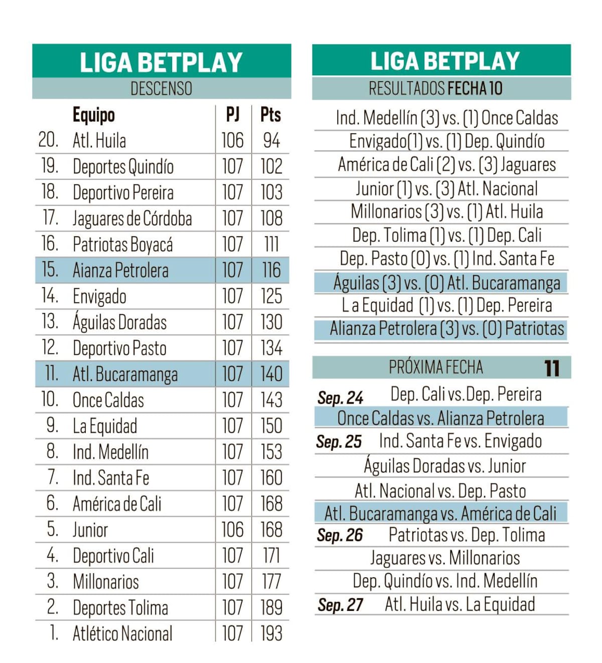 Alianza Petrolera, con su victoria 3-0 sobre Patriotas, fue uno de los beneficiados, al saltar al quinto lugar con 17 unidades, a una de Envigado, que es otra de las sorpresas. El grupo de los ocho lo completan Pereira, Quindío y América.