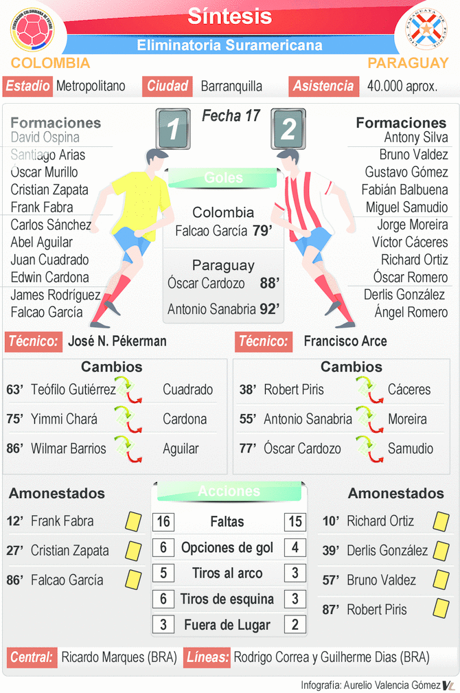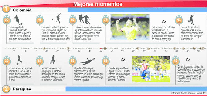 La mejor versión de Colombia apareció en los primeros minutos del complemento. ‘La Amarilla’ atacó por las bandas, con Fabra y Arias; se asoció en el medio, con James y Cardona, y poco a poco metió en su propio campo a un ‘moribundo’ Paraguay.