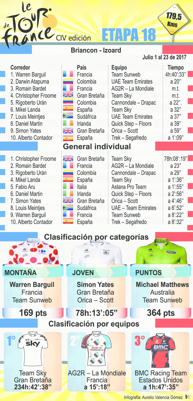 La última etapa de alta montaña del Tour de Francia, que por primera vez finalizó en el Izoard, le permitió a los tres primeros de la clasificación general afianzarse en el podio, que al parecer ya tiene dueño en el primer cajón, pues el británico Christopher Froome conservó a raya al francés Romain Bardet (a 23’’) y al colombiano Rigoberto Urán (a 29’’), quienes difícilmente descontarían la diferencia en la contrarreloj de mañana, donde el favorito es el capo del Sky.