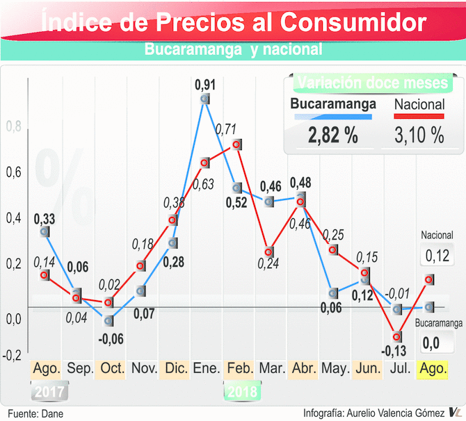 De acuerdo con el último informe del Índice de Precios al Consumidor, IPC, del Departamento Administrativo Nacional de Estadística, Dane, la inflación de Bucaramanga y su área metropolitana para agosto de 2018 fue de 0,00%, frente al resultado de julio de este año, tuvo un avance de 0,1 pp. No obstante, se ubicó entre una de las más bajas del país.