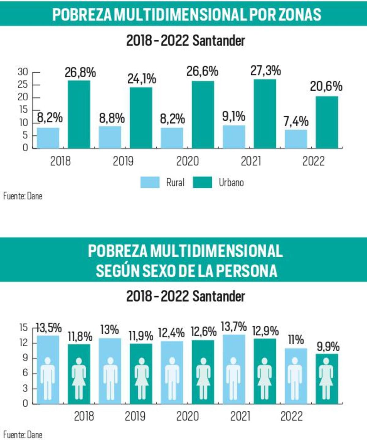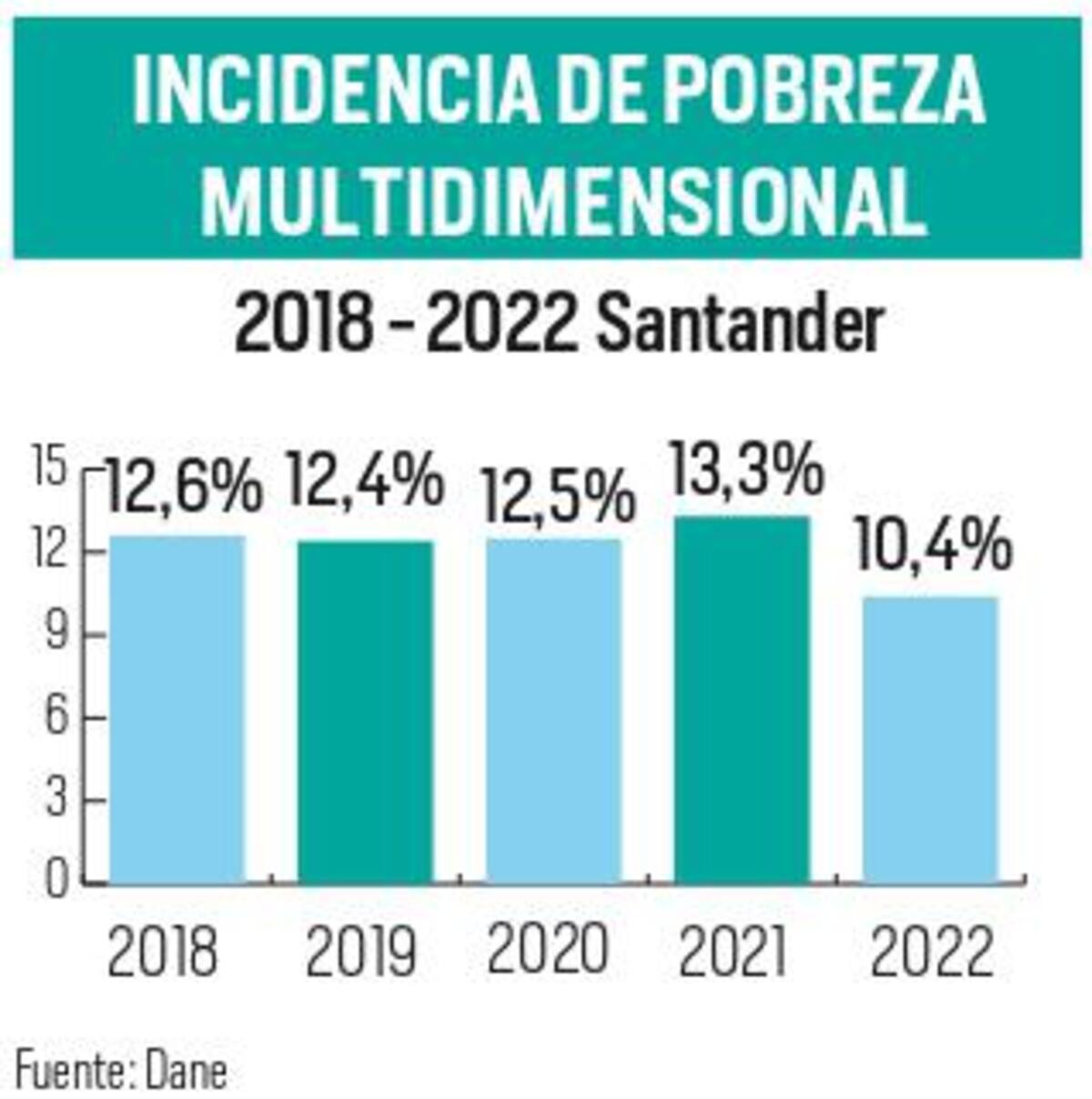 El Departamento Administrativo Nacional de Estadístico (Dane) presentó ayer los resultados de este indicador, y para la región se registró una baja en la pobreza multidimensional en 2,9 puntos porcentuales, al pasar de 13,3 % en el 2021 al 10,4 en el 2022, ubicando a Santander en la novena posición entra los departamentos.