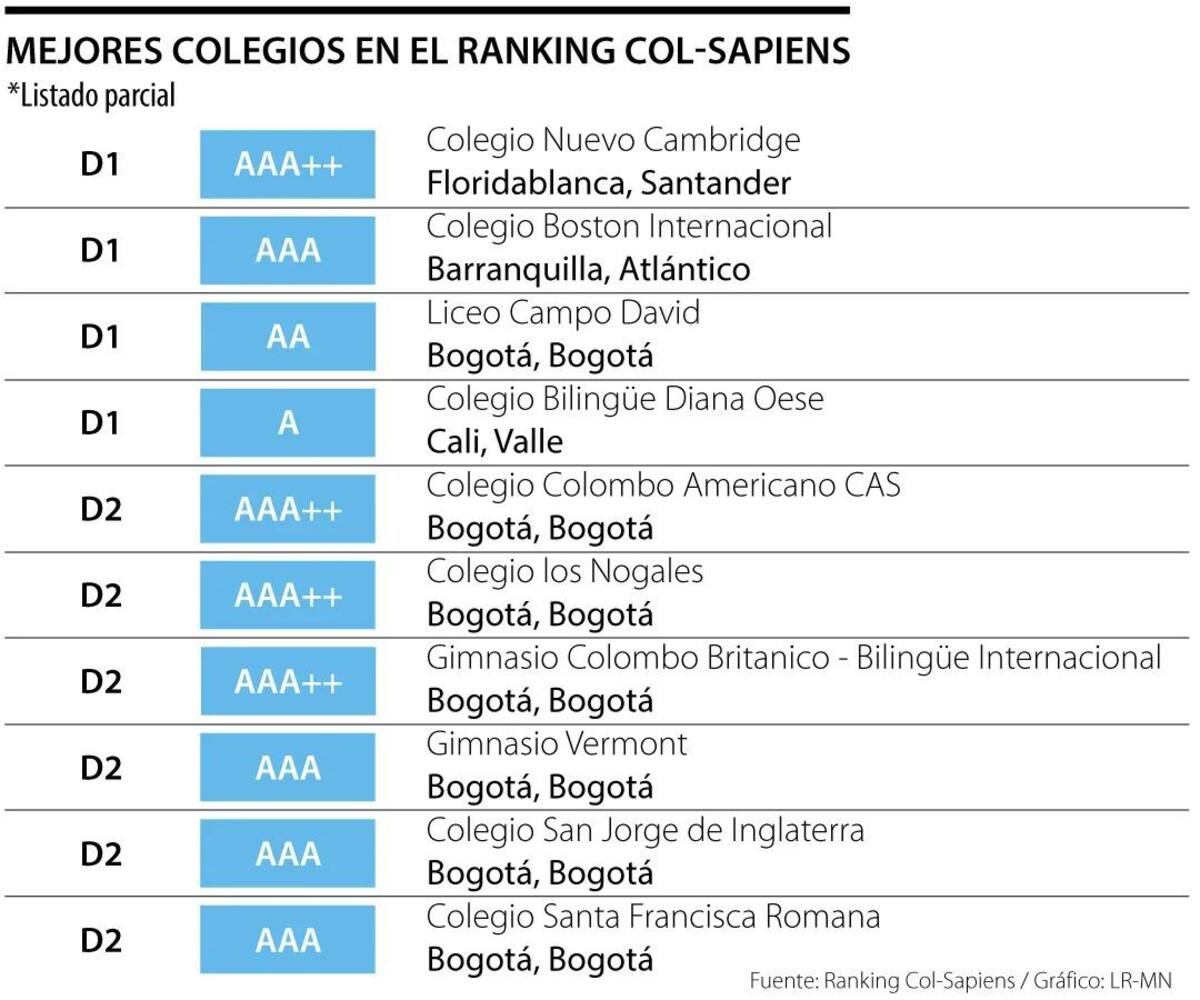 En cuanto a los que alcanzaron las categorías más altas en desempeño académico, solo cuatro destacaron en D1 (la categoría más alta), como el Colegio Nuevo Cambridge de Floridablanca (Santander). Los otros tres son el Colegio Boston Internacional, el Liceo Campo David y el Colegio Bilingüe Diana Oese.