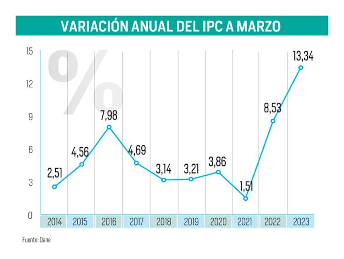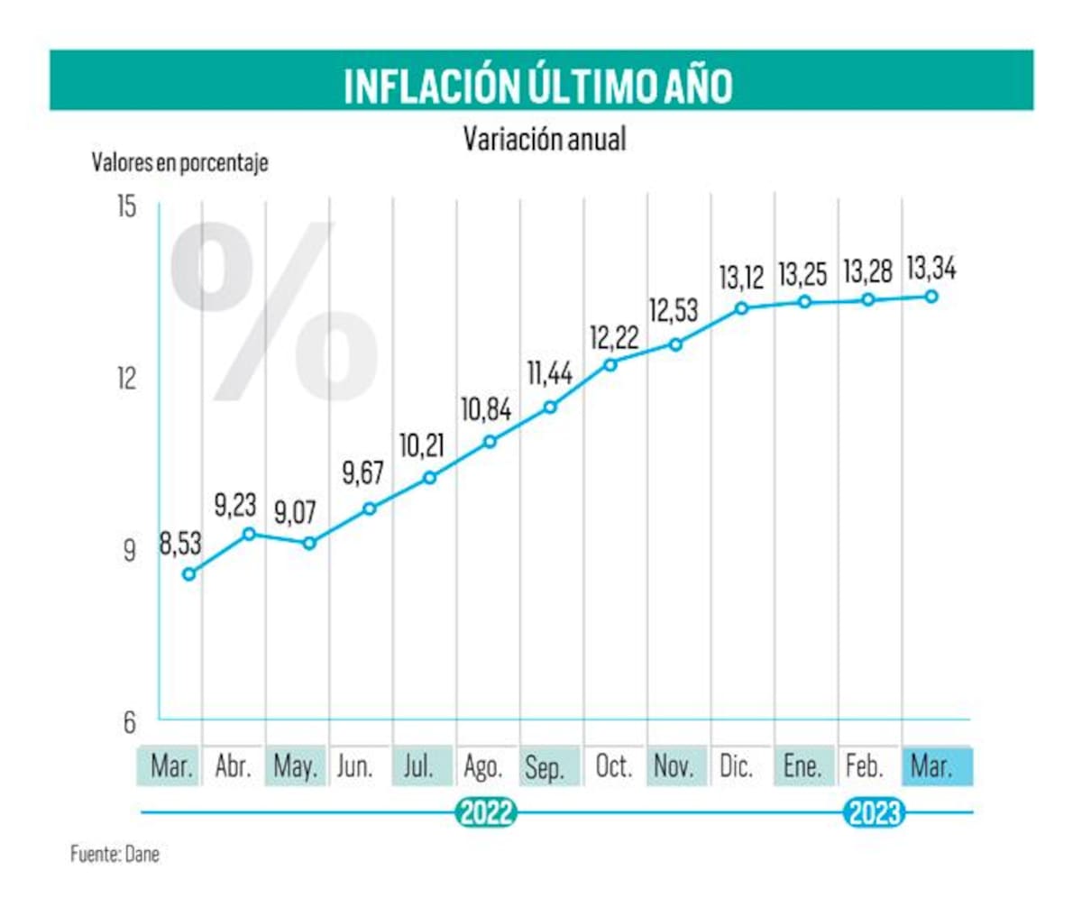 Enero de 2023: 13,25 %. Febrero de 2023: 13,28 %. Marzo de 2023: 13,34 %. Es decir, tras culminar el primer trimestre del 2023, la inflación en Colombia sigue subiendo mes a mes, apretando cada día más el bolsillo de las familias colombianas.