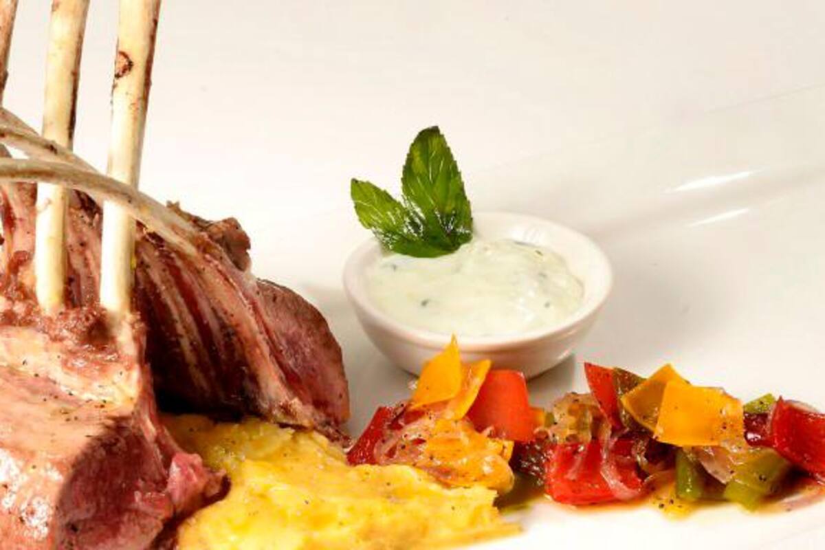 10. Por último, corte el cordero a la mitad y ubique las porciones una frente a la otra, de manera que los huesos se entrelacen. Sirva con el puré y el ragout de pimentones.