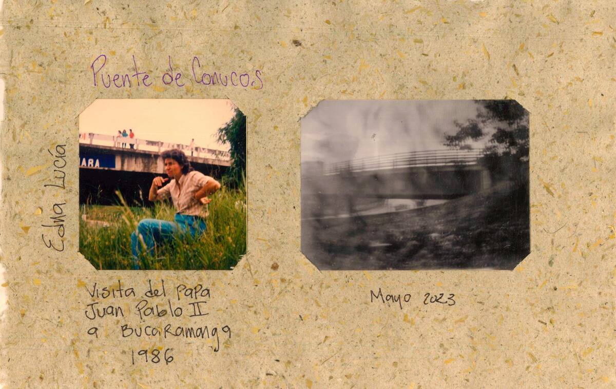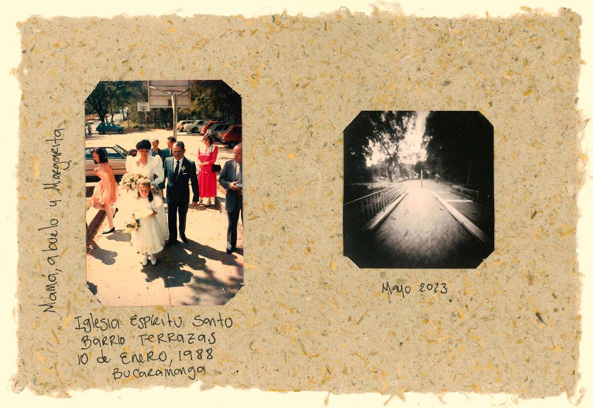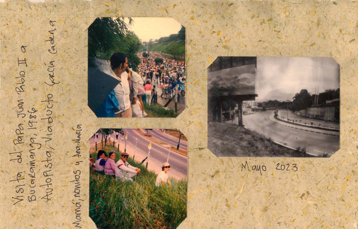 “Escogí varias fotos familiares que fueron tomadas en distintos puntos de la ciudad. Por ejemplo, algunas de las fotos fueron tomadas en Pan de Azúcar, donde se ubicaba la casa de mis abuelos. También utilicé algunas fotos de la autopista cerca de la puerta del sol, por donde pasaría el papa Juan Pablo II en 1986, en su visita a Bucaramanga, que fueron tomadas por mi mamá y mis abuelos”, señala. “Además, incluí algunas imágenes capturadas en la autopista cerca de la Puerta del Sol, que va hacia el viaducto. Todas estas fotos las volví a tomar yo con fotografía estenopeica, creando así una conexión entre el pasado y el presente, y entre mi familia y la ciudad”, explica.