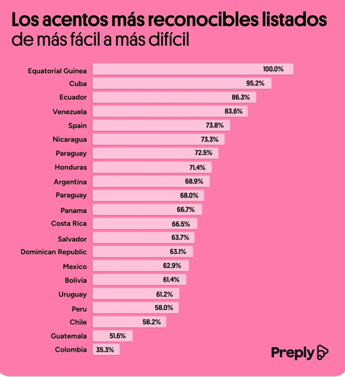 De acuerdo con los resultados, los acentos que generan mayor dificultad para los participantes son los de Colombia, Guatemala, Chile, Perú y Uruguay.