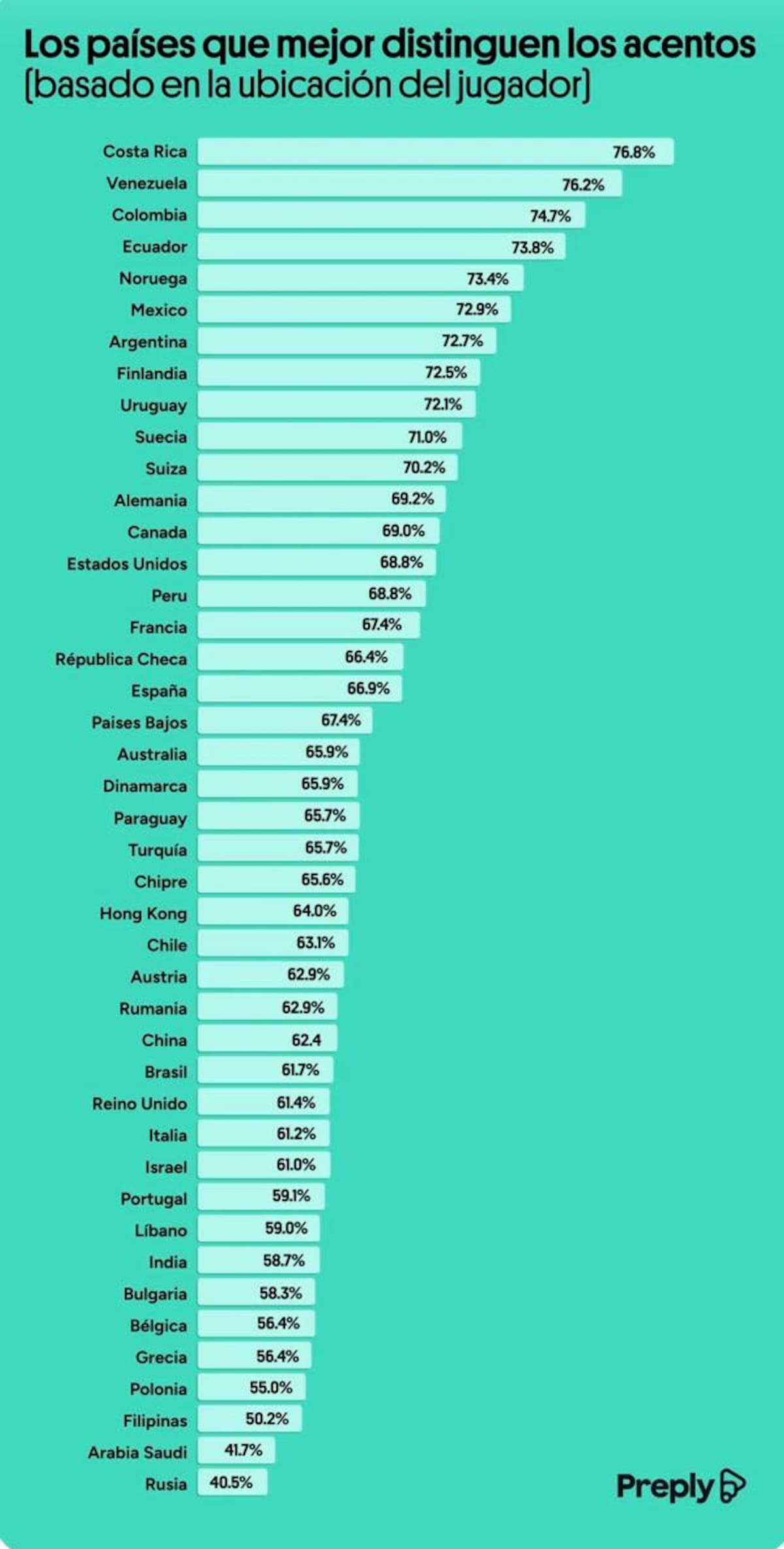 El estudio también destaca a los países con mayor habilidad para reconocer las variaciones del español. Costa Rica, Venezuela, Colombia y Ecuador encabezan la lista, junto con Noruega, que sorprende al superar a naciones tradicionalmente hispanohablantes como México o Argentina. Otros países nórdicos como Finlandia y Suecia también figuran entre los mejores.