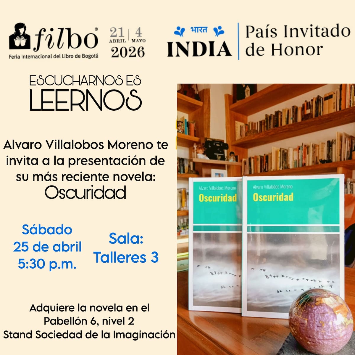El escritor santandereano Álvaro Villalobos Moreno invita al público a la presentación de su más reciente novela, Oscuridad, este sábado 25 de abril a las 5:30 p.m. en la Sala Talleres 3. La obra puede adquirirse en el stand de la editorial Sociedad de la Imaginación, ubicado en el Pabellón 6, nivel 2.