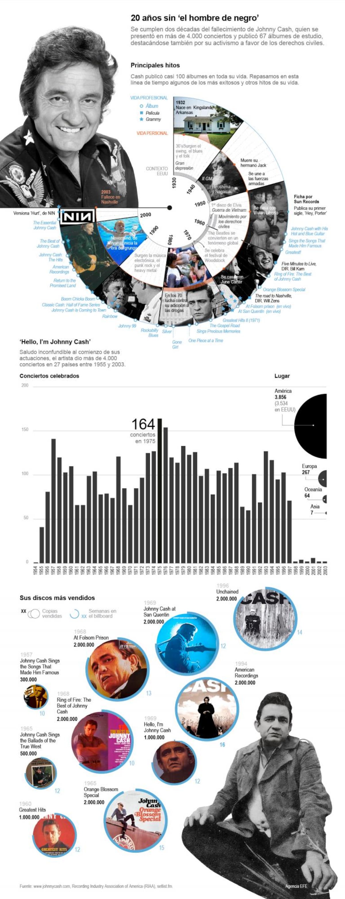 Se cumplen dos décadas del fallecimiento de Johnny Cash, quien se presentó en más de 4.000 conciertos y publicó 67 álbumes de estudio, destacándose también por su activismo a favor de los derechos civiles.