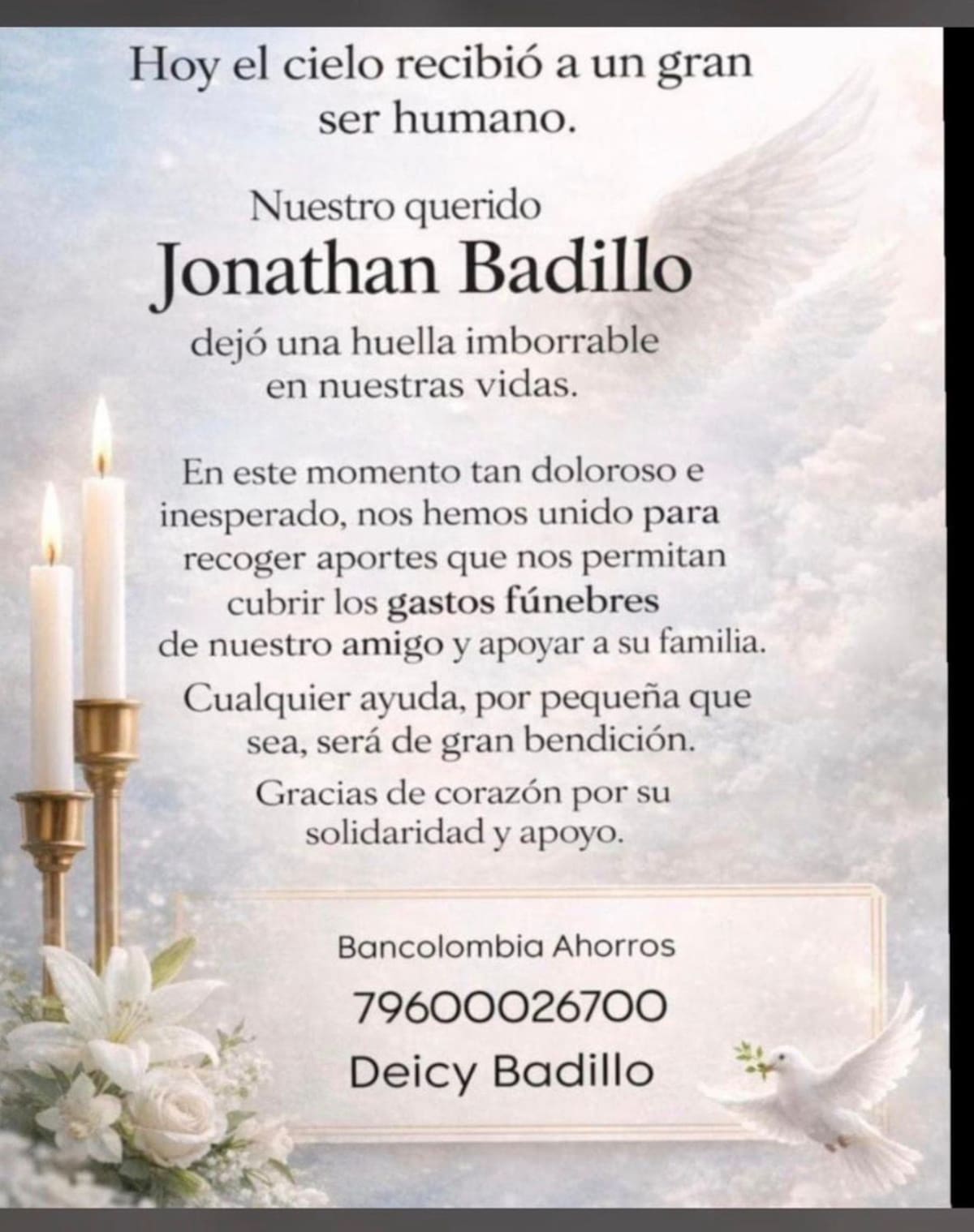 “En este momento tan doloroso e inesperado, nos hemos unido para recolectar aportes que nos permitan cubrir los gastos fúnebres de nuestro amigo y apoyar a su familia. Cualquier ayuda, por pequeña que sea, será de gran bendición. Se ha dispuesto la cuenta de Bancolombia Ahorros 79600026700, a nombre de Deicy Badillo”, señalaron en un comunicado.