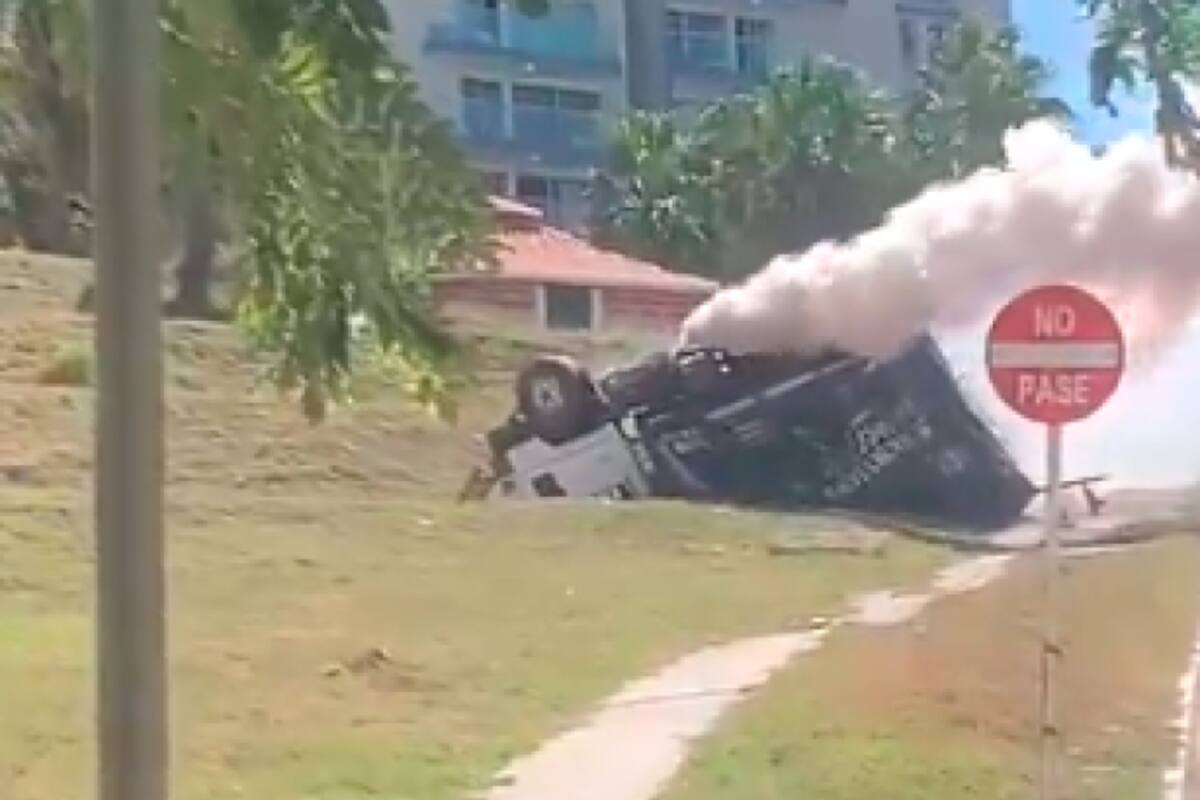 En la grabación se puede observar al tractocamión completamente boca arriba, mientras sale humo blanco de su interior.