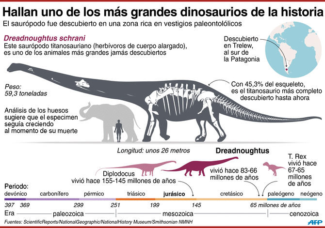 Un equipo de paleontólogos presentó Dreadnoughtus schrani, el dinosaurio más grande de la historia, que vivía hace 77 millones de años en la Patagonia argentina, cuyo esqueleto es “el más completo” que se ha encontrado hasta ahora.