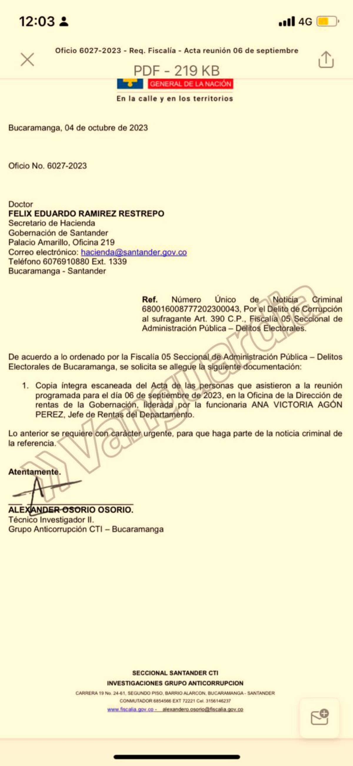 Con la nota criminal 680016008777202300043, con fecha del 4 de octubre del 2023, la Fiscalía Delegada le pidió al secretario de Hacienda departamental Félix Eduardo Ramírez (uno de los funcionarios de mayor confianza del gobernador Mauricio Aguilar), la “copia íntegra escaneada del acta de las personas que asistieron a la reunión programada el 6 de septiembre del 2023, en la Oficina de la Dirección de Rentas de la Gobernación, liderada por la funcionaria Ana Victoria Agón Pérez, jefe de Rentas del Departamento”.